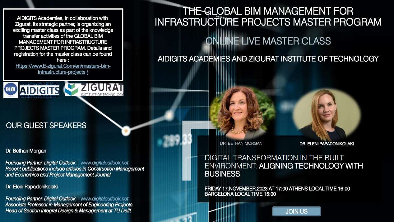 AIDIGITS Academies, in collaboration with Zigurat, its strategic partner, is organdng an exciting master class as part of the knowledge transfer activities of the GLOBAL BIM MANAGEMENT FOR INFRASTRUCTURE PROJECTS MASTER PROGRAM. Details and registration for the master class can be found here Https://www.E-zIgurat.ConVenfiresters-blm-infrastructureuoi.